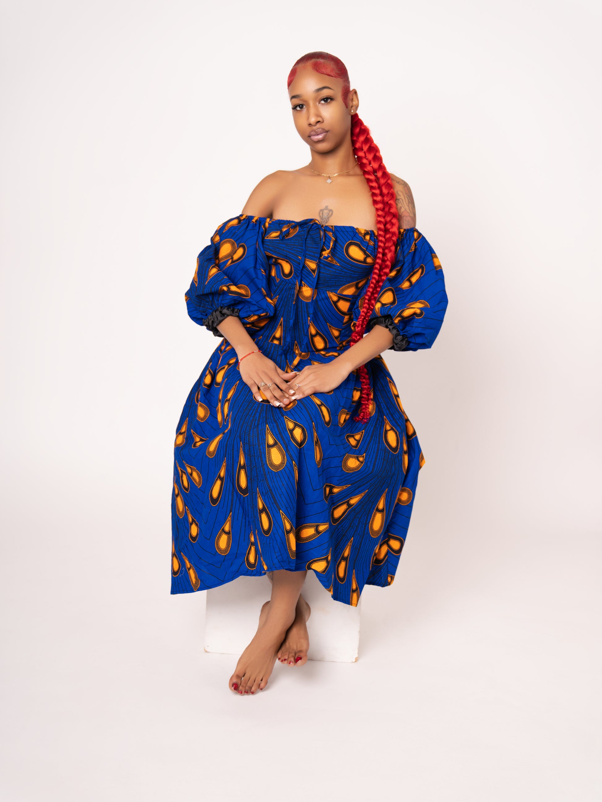 The Sade Dress is an ode to timeless femininity—elegant, regal, and unmistakably powerful. This Ankara print midi dress is beautifully structured with a sculpted bodice, romantic milkmaid neckline, and voluminous long puff sleeves that add drama without overpowering. The flared silhouette cinches at the waist and flows into a tiered skirt that sways with grace. The neckline is convertible — designed to be worn on or off the shoulder, so you can style it modestly or give it a soft, romantic edge.